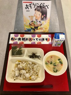 上段の写真は、本日の給食と給食図書です。本日の給食図書は、「おぞうにくらべ」でした。全国各地の色々な種類のぞう煮が紹介されている絵本でした。