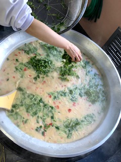 下段の写真は、ぞう煮にみつばを加えて仕上げているところです。