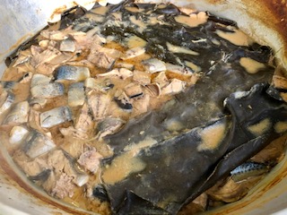 さばのみそ煮は、だしこんぶを敷いた釜にさば、みそ、みりん、砂糖、しょうがを加えて煮込んだ、煮魚料理でした。
