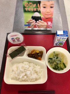 上段の写真は、本日の給食と給食図書です。本日の給食図書は、「のりができるまで」でした。焼きのりの出来るまでの様子が載っている図書でした。