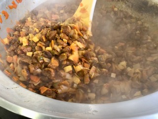 下段の写真は、酢豚を仕上げているところです。炒めた野菜と揚げた豚肉を和えています。