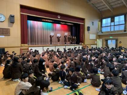 朝の児童集会ではクイズ「イントロ ドン」をしました。子どもたちは1〜6年縦割りの「なかよし班」で相談しながらクイズを楽しみました。