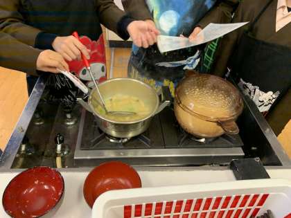 5年生は家庭科の調理実習で「ごはんとみそしる」を作りました。班で協力しておいしくごはんが炊けました。
