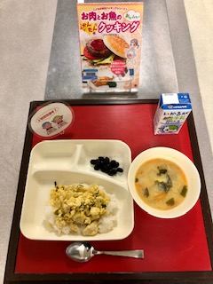 上段の写真は、本日の給食と給食図書です。本日の給食図書は、「お肉とお魚のかんたんクッキング」でした。親子丼やハンバーガー、いわしのかば焼き等の作り方が、子ども向けにわかりやすく説明されたレシピ集でした。