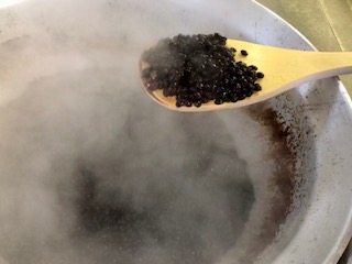 下段の写真は、出来上がった黒豆の煮ものです。