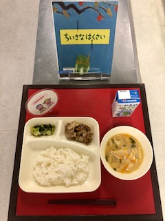 上段の写真は、本日の給食と給食図書です。本日の給食図書は、「ちいさなはくさい」でした。はくさい畑からはみだして育った小さなはくさいの絵本でした。