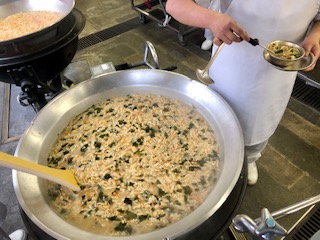 下段の写真は、出来上がったみそ汁です。しっかりと温度が上がっていることを温度計で確認しています。