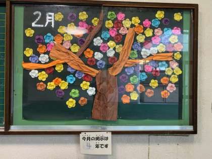 掲示板には3年生の作った作品が飾られています。3年生はコンパスの使い方を学習したので、それを使って花の形を作りました。色とりどりの梅の花が咲いたようですね。