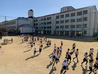 15分休みには1,2年生が「ランラン週間」で運動場を走っています。1年生は初めての体験ですが、寒い中を元気に走っています。