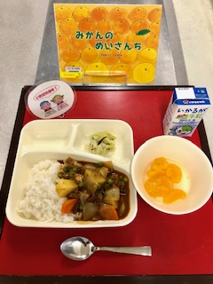 上段の写真は、本日の給食と給食図書です。本日の給食図書は、「みかんのめいさんち」でした。「みかんの名産地(めいさんち)」に住んでいるしんせきのおじさんから届いたたくさんのみかんの前で、男の子が色々な想像を膨らます絵本でした。