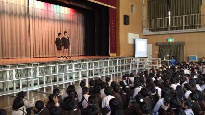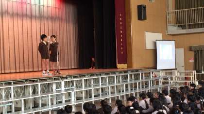 11月10日(月)講堂での全校朝会で舞台に突然二人組が「はーい、どうも」と現れて、見ている全校児童はびっくりしました。