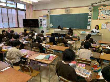 今日は児童集会がなかったので、子どもたちは各教室で読書タイムをしました。1年生の子どもたちも図書委員に見守られながら、自分の読みたい本を読みました。