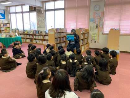 図書の時間には、借りた本の返却をして読みたい本を借りた後、図書館司書の先生に紙芝居を読み聞かせてもらいました。