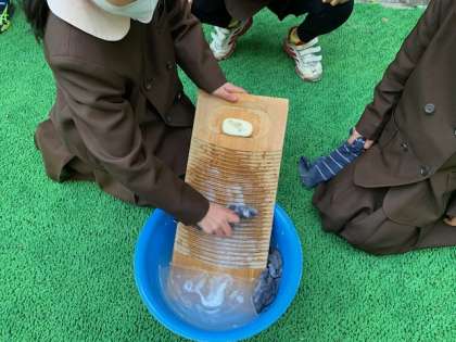 3年生は社会科「むかしのくらしを調べよう」で、せんたく板体験をしました。水がとても冷たかったですが、一生懸命自分の靴下を洗いました。