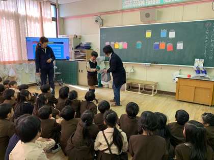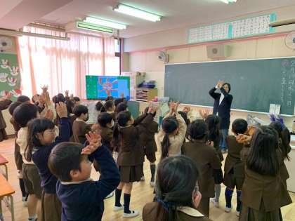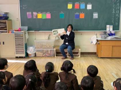 1年生は、朝のTET(鶴南イングリッシュタイム)でふだん食べ物や色について学習しています。今日はそれを生かして"Chomp Chomp Chomp"という英語の絵本を読み聞かせしてもらいました。この本は、カタツムリがいろいろな食べ物を食べてその色のウンチを出すという楽しい内容です。1年生の子どもたちは大喜びで、大きな声で英語を話してたりダンスをしたりしていました。4月から学年が一つずつ上がっても、楽しく英語を学習してほしいですね。