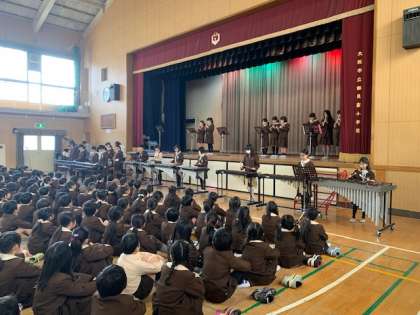 今日は、講堂で器楽合奏クラブの発表がありました。舞台に並んだクラブ員は「ミッキーマウスマーチ」「ア・ホールニューワールド」「パプリカ」の3曲を演奏し、大きな拍手をもらいました。
