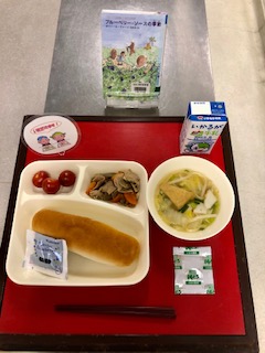 2月20日(木)の献立は、「コッペパン・ブルーベリージャム・豚肉とごぼうの煮もの・なにわうどん・牛乳」でした。