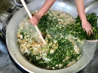 下段の写真は、なにわうどんに青ねぎを加えて仕上げているところです。