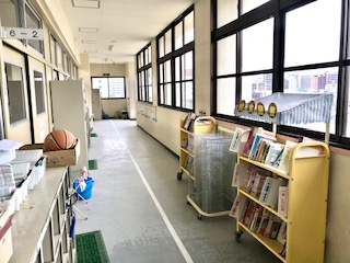 移動式給食図書コーナーは、4階の6年2組の廊下の前へ移動しました。