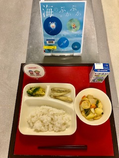 上段の写真は、本日の給食と給食図書です。本日の給食図書は、「海のぷかぷか ただよう海の生きもの」でした。大きな海に漂う、小さなクラゲや子イカや魚の幼魚等が載っている図書でした。