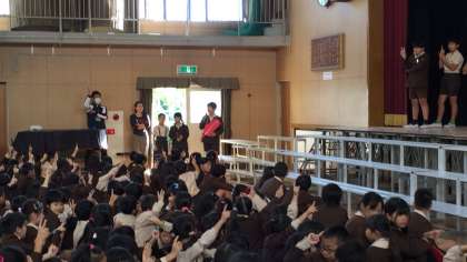 先週の児童集会に「赤羽根さん」(児童会代表委員)が現れて、共同募金のしくみや使い道について説明してくれました。その内容を記した「児童会だより」も配付されました。