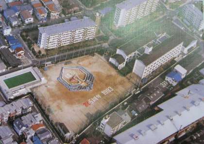 下の写真は1993年、創立5周年の航空写真です。まだ南校舎増築前なので運動場が広いですね。