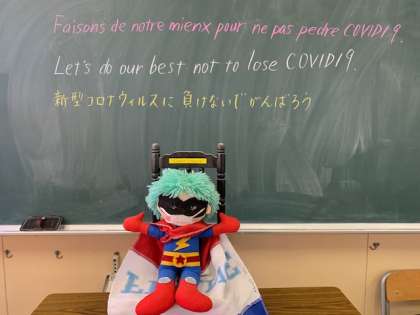先日本校と交流のある、フランスのJules Ferry小学校に、向こうからもらったSuper Franceの人形にマスクを着けて、フランス語・英語・日本語で「新型コロナウィルスに負けずにがんばろう」のメッセージを送りました。早速"Hello, Tsurumiminami! Thank you so much it's a pleasure to see Super France with mask. We're safe but it's complicated. Our school has been closed since the biginning of March. We teach on the internet. Affectionate thoughts of France."(こんにちは鶴見南小学校。マスク姿のスーパーフランスに会えてうれしいです。私たちは無事ですが、学校は3月初めから閉じています。インターネットで授業をしています。フランスから愛を込めて)という英語の返事と、トゥールーズに咲く花の写真が送られてきました。