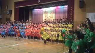 2年生は「コローリの伝説!?]でカラフルな衣装をつけて楽しいお話を演じ、みんなの笑顔で作った大きなピースサインを背景に「笑顔でピース」を歌いました。1年生も2年生も可愛さ満開でした。