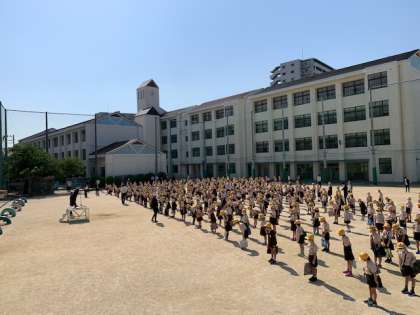 5月13日(水)今日は2〜6年生の初めての登校日でした。2,3,5年生と4,6年生に分かれてマスク姿で登校し、それぞれ運動場で広く間隔を開けて並び、校長先生とあいさつをしてお話を聞きました。校長先生から「今年は新型コロナウィルス感染拡大防止のためにいつもと違う始まりになりました。身体の健康と共に、心の免疫力も高めることが大切です。そのためにはルールを守って楽しい学校にしましょう。6年生は最高学年としてがんばってください。」というお話があり、教職員の紹介がありました。