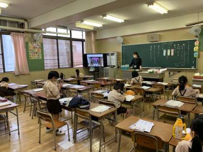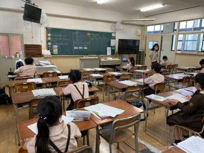 4年生は次の学習課題で出てくる算数のわり算の筆算のしかたをワークシートを使って学習しました。先生に名前を呼ばれて当てられると「はい、〜です。」としっかり答えていました。