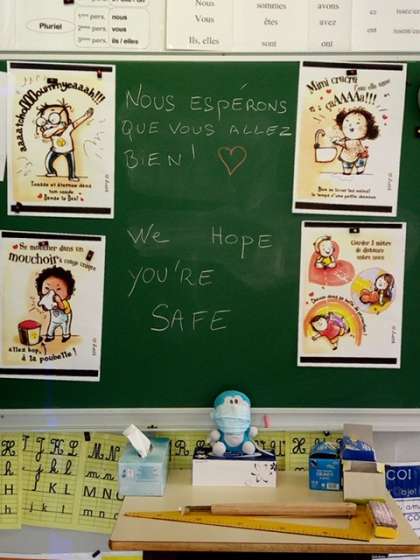 Hello, friends! We came back in classroom in France in small numbers and we are careful. See you soon. Doraemon (こんにちは、お友だち! フランスでは教室に少人数での授業が始まりました。でも気を付けています。またすぐにお会いしましょう。ドラえもんより)