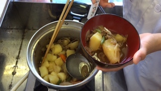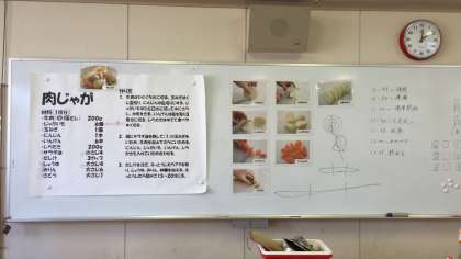 今回のメニューは「肉じゃが」です。初めに身支度をしてから、班で協力して作り始めました。牛肉はひとくち大に、玉ねぎはくし型切り、にんじんは乱切り、じゃがいもは一口大と食材によって切り方もいろいろです。他にいんげんや白たきも入れました。入れる順番を考えていため、だし汁を入れて煮ます。アクを取って、しょうゆ・みりん・砂糖を加えていきました。