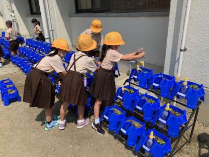1年生は、自分のアサガオに嬉しそうに水をあげていました。