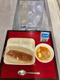 上段の写真は、本日の給食と給食図書です。本日の給食図書は、「うまれたよ!イカ」でした。ヤリイカの一生が写真でわかる、読み聞かせができる写真図書でした。