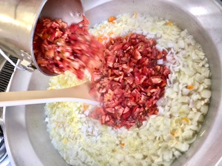 下段の写真は、スープ煮にトマトを加えているところです。本日は生のトマトを使用しました。