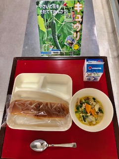 上段の写真は、本日の給食と給食図書です。本日の給食図書は、「やさいと花をそだててかんさつ キュウリ」でした。キュウリの栽培の仕方や観察のポイントがわかる図書でした。