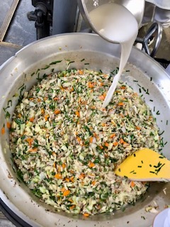 下段の写真は、中華煮に水溶きでんぷんを加えて、とろみを出しているところです。