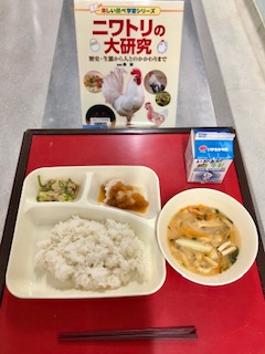 上段の写真は、本日の給食と給食図書です。本日の給食図書は、「ニワトリの大研究」でした。ニワトリの歴史や生態、人との関わりがわかる調べ学習用の図書でした。