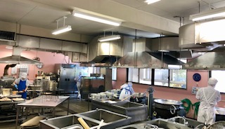 下段の写真は、調理室の様子です。写真左手では焼き上がった鶏肉を、写真中央では出来上がった野菜いためをそれぞれ配缶しています。写真右手では、みそ汁を仕上げています。