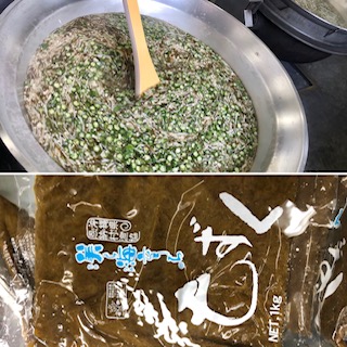 下段の写真は、とろり汁を仕上げている様子と本日使用したもずくです。もずくは沖縄県産のものを使用しました。