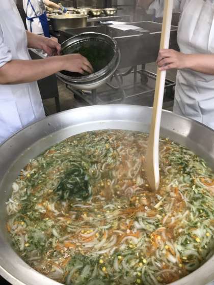 下段の写真は、スープにパセリを加えて仕上げているところです。