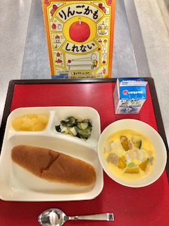 上段の写真は、本日の給食のサンプルと給食図書です。本日の給食図書は、「りんごかもしれない」でした。少年がキッチンテーブルのりんごを見て、「…でもこれはりんごじゃないかもしれない」と考え始め、色々な楽しい仮説を立てる絵本でした。