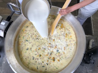 かぼちゃのクリームシチューは、具材にベーコン、鶏肉、たまねぎ、マッシュルーム、むき枝豆、そしてかぼちゃが入った、牛乳や生クリームを使用した汁ものでした。シチューのとろみのもとになるルウは、給食室でいちから作っています。