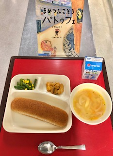 上段の写真は、本日の給食のサンプルと給食図書です。本日の給食図書は、「まめつぶこぞうパトゥフェ」でした。豆つぶほどしかない小さな男の子、パトゥフェが活躍するスペイン、カタルーニャ地方の昔話でした。