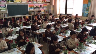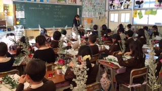 今年も池坊華道教授木挽先生と池坊華道の村上先生に来ていただき、4年生の学級に順番に入って生け花の指導をしてくださいました。初めに生け花は550年以上も前から日本にある伝統文化だということ、「よろしくおねがいします」「ありがとうございました」というマナーが大切であることを聞きました。