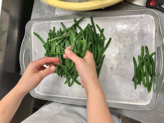冷凍の三度豆の検品ひとつとっても安全、安心の給食調理に努めていることがわかりますね。