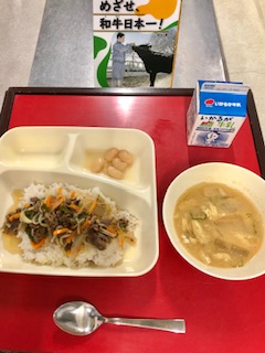 本日の給食を食べた児童の感想には、「牛丼のお肉に味がしみ込んでいて、ごはんがすすみました。(2年生)」「大福豆の煮ものは甘くて、柔らかくて美味しかったです。(2年生)」等がありました。