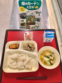 上段の写真は、本日の給食のサンプルと給食図書です。本日の給食図書は、「緑のカーテン大百科3」でした。「緑のカーテン」で実ったゴーヤやへちまの調理例や、地域や企業のエコ活動の取り組み内容が載っている図書でした。