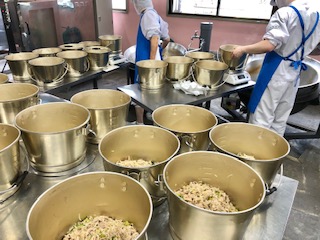 下段の写真は、ゴーヤチャンプルーの配缶の様子です。