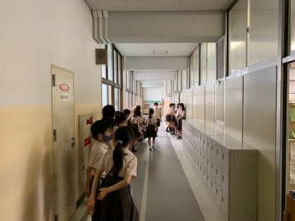 今日の内容は「前期児童会運営委員、学級代表のあいさつ」です。全員で30人を超える人数が職員室から放送するので、職員室前の廊下に並んで順番にマイクに向かいました。